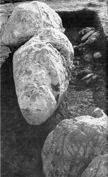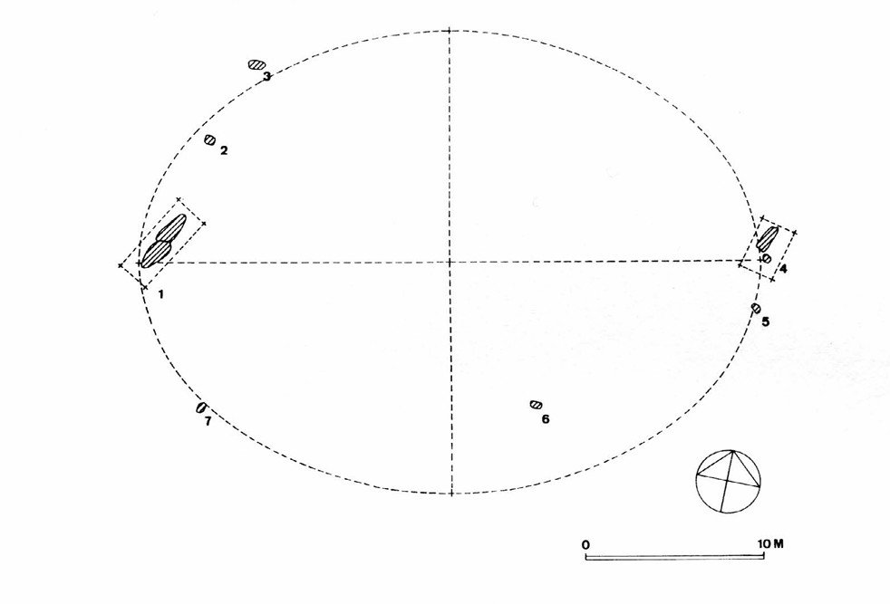 This cromeleque is in elliptical shape, with its long axis oriented east-west and measuring around 35 meters. There were originally seven menires documented, all cylindrical and made from white limestone. They measured from a little over a half meter to nearly 4 meters in height. I was able to identify five of them. There were two other stones that may have been the others, moved out of their original locations.