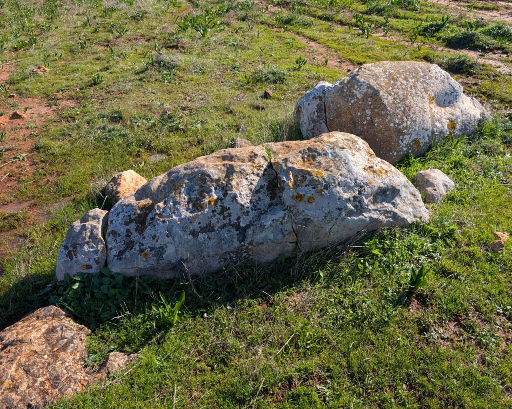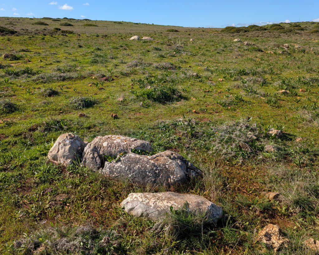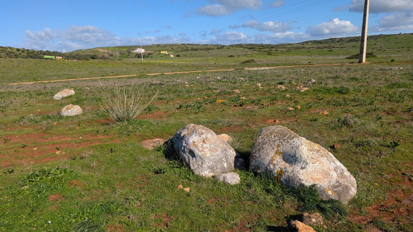 These aren’t just any menires: they are part of a stone circle, or cromeleque (Portuguese spelling). The Cromeleque de Amantes 1 was identified in the 1970s by archaeologist Mário Varela Gomes and documented in the 1980s1. Contemporary maps and guides to the megaliths of the area of Vila do Bispo don’t mention it. Gomes identified the nearby group of menires as being “Menires de Amantes 2,” stating it was possibly a cromeleque. The Archaeologist’s Portal on the Cultural Heritage website identifies it as a second cromeleque.