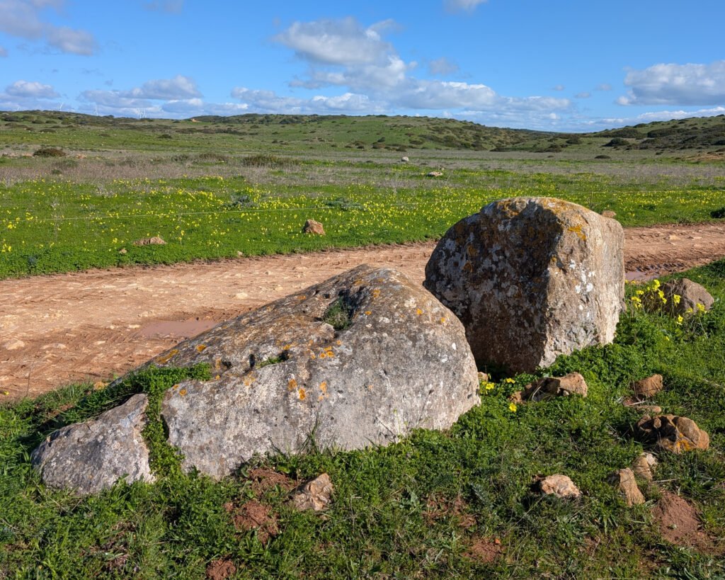 The Menires of Pedra Escorregadia (and the necropole next to them) are on the same road/route. There are other menires in the area, although they are not well marked or easily identified. The museum in Vila do Bispo (“Celeiro da História”) is an excellent source of information, including maps of the route.