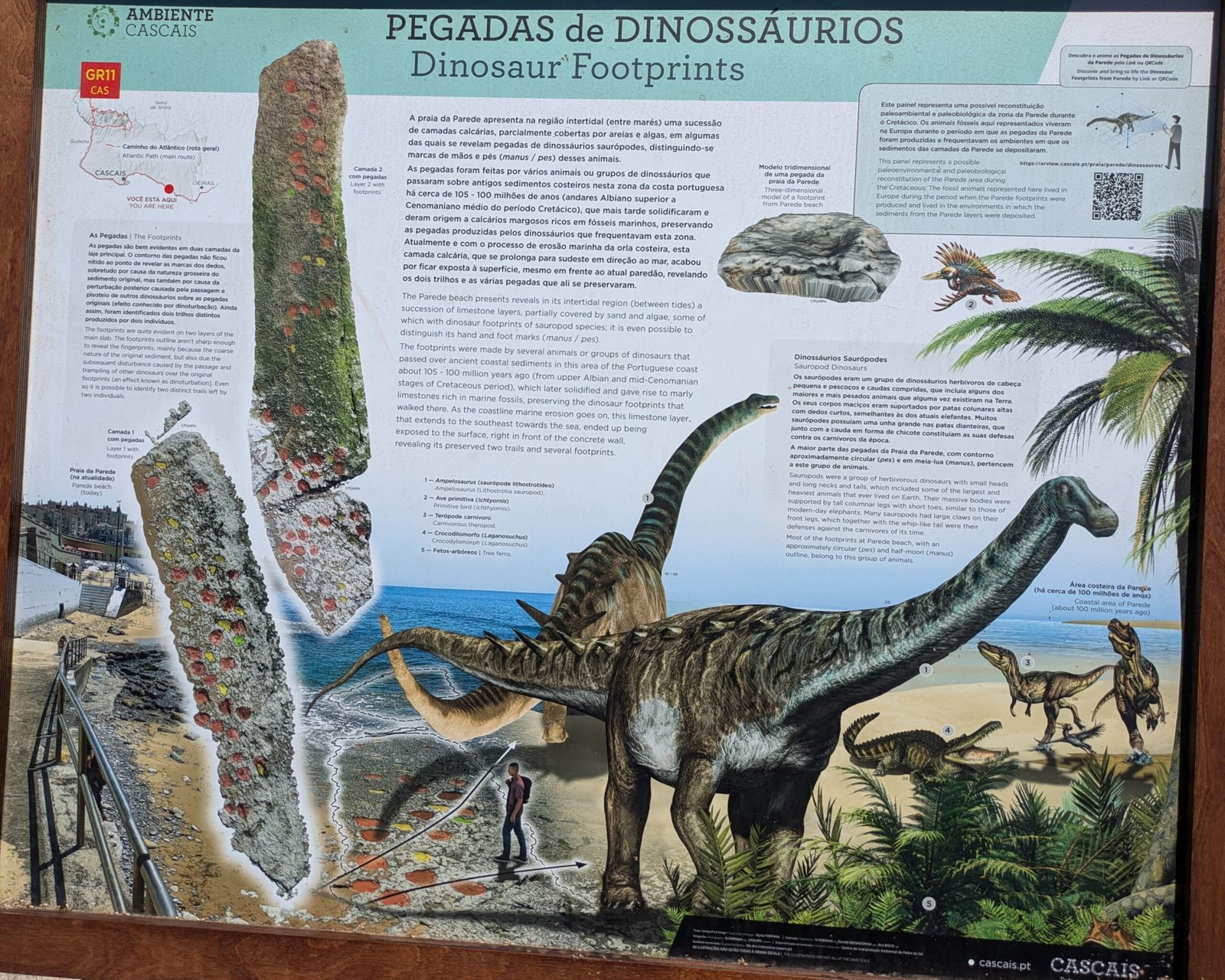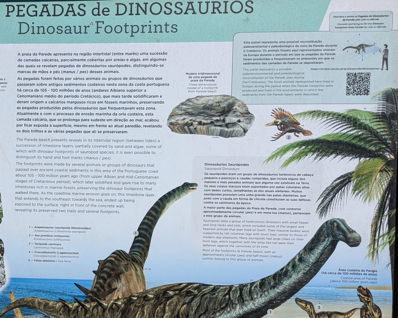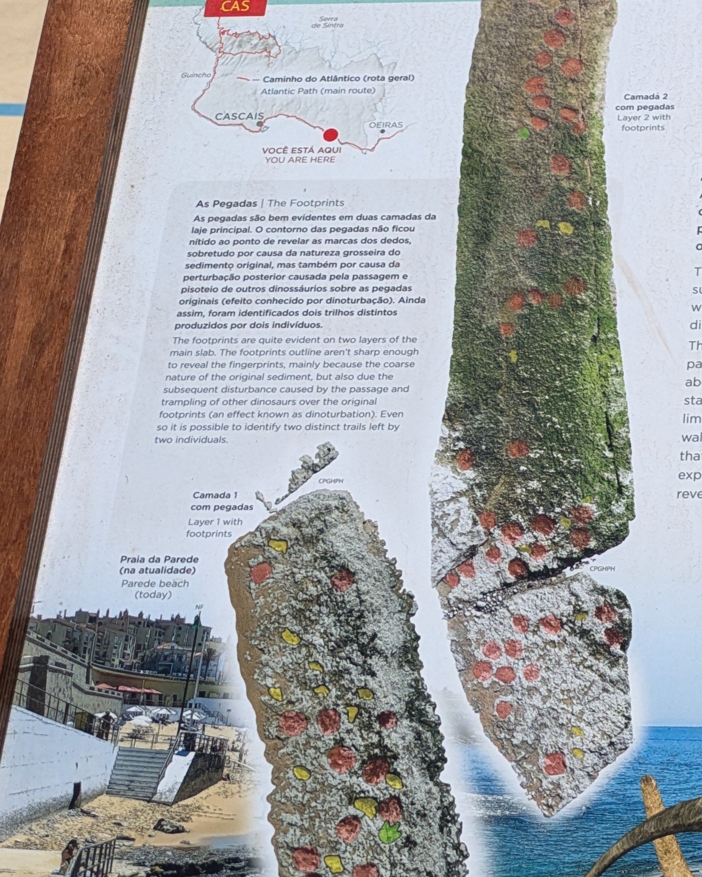 Updated August 2024: The municipality has put up a large mural depicting many dinosaurs that have been found in Portugal, and have put up a detailed noticeboard with loads of information about the site and the footprints. There’s also an augmented reality website (link below).