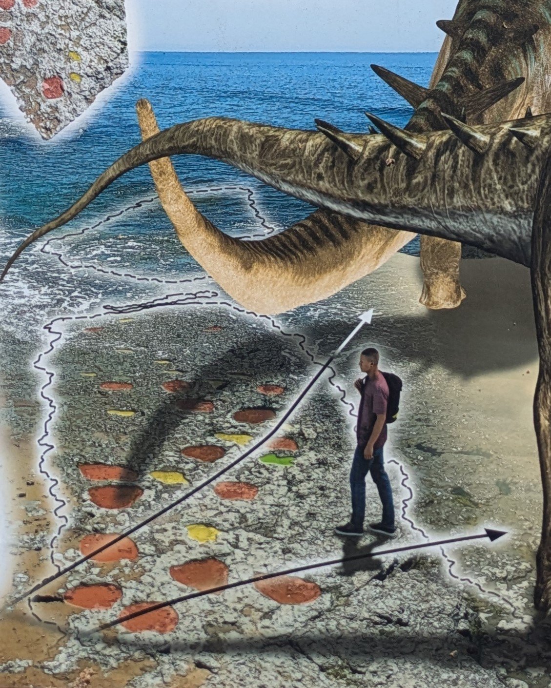 It’s a sunny day at the beach in Parede, on the Lisbon coast. Families have set up beach chairs and towels on the sand. Children are playing in the small puddles in the beach rocks. Some splash at the water in a series of nearly circular bowls, 50cm across. Few of them, if any, realize that what they are playing in are the traces of a dinosaur which came walking through shallow water 100 million years ago, leaving footprints in the mud that have become preserved even to the present day.