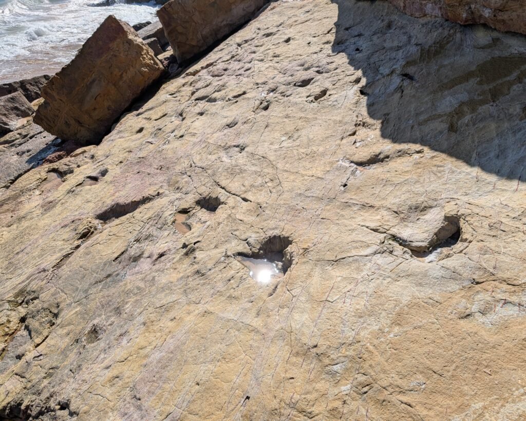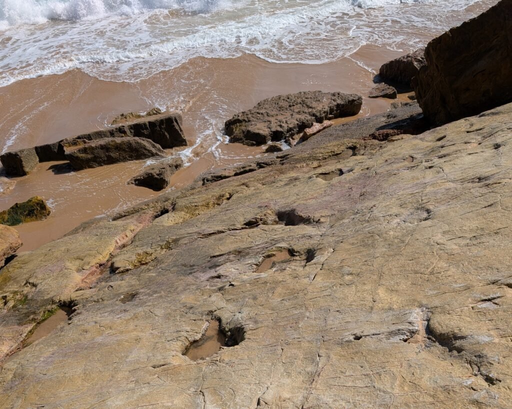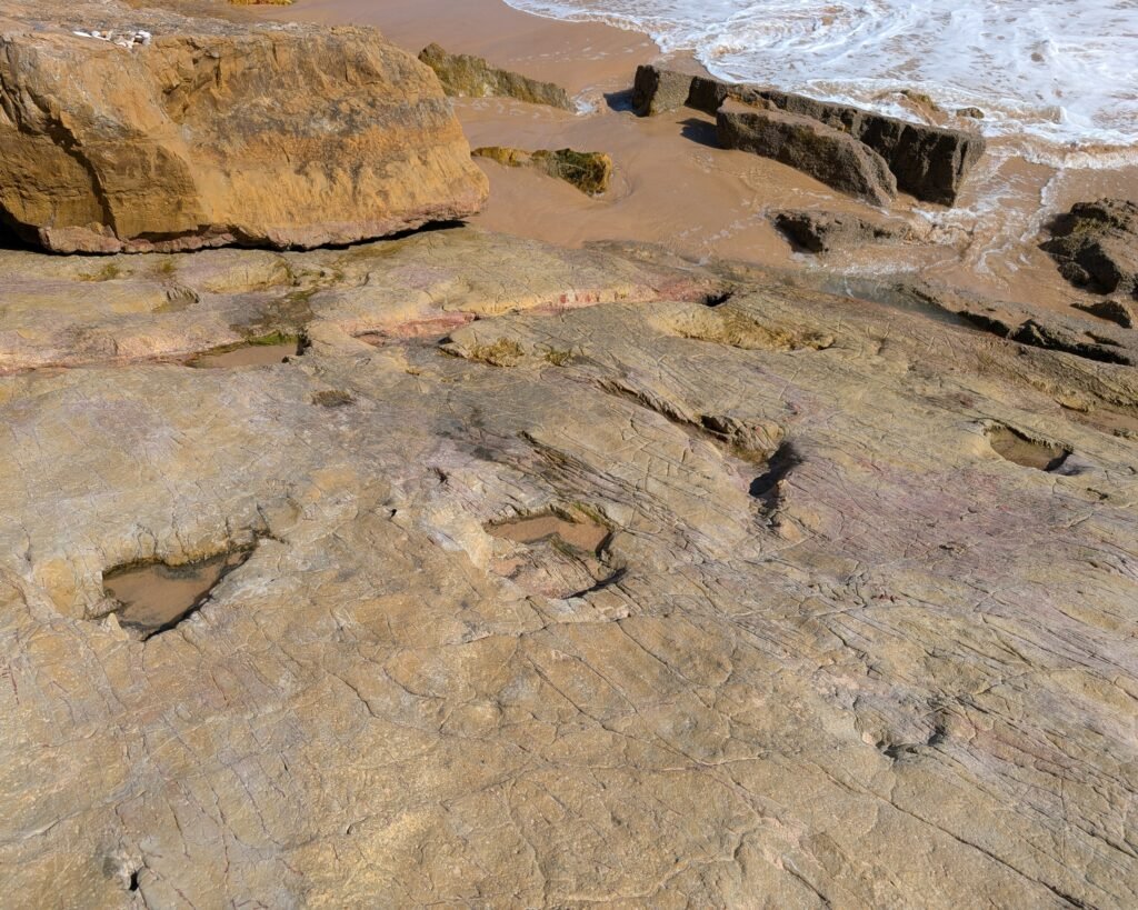 There are three track levels at the eastern edge of Praia Santa (Santa Beach). There are very well preserved and clear prints that have characteristic shape of ornithopod footprints, and are very similar to prints which have been attributed to Iguanodontipus.