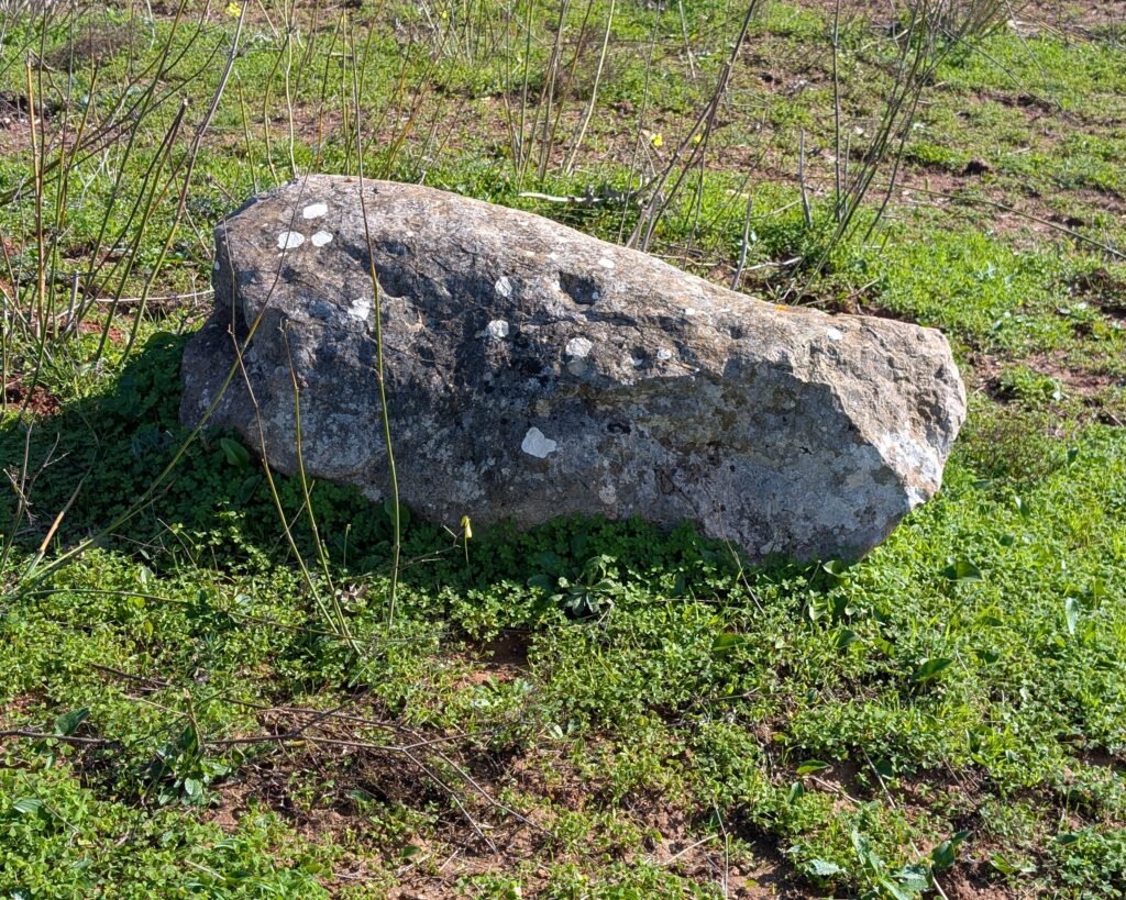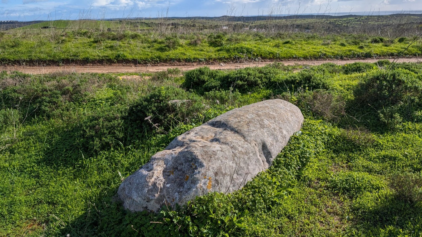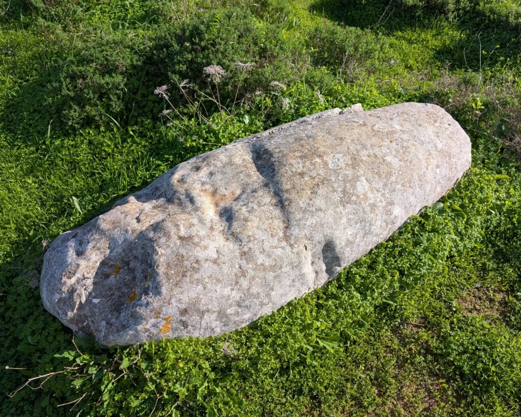 There are more than twenty menires (“menhirs”) in the area, all fallen. Some are broken. They have very likely been moved from their original locations by farmers. (This area was heavily used for wheat farming in the 20th century.) They are not well documented or listed.