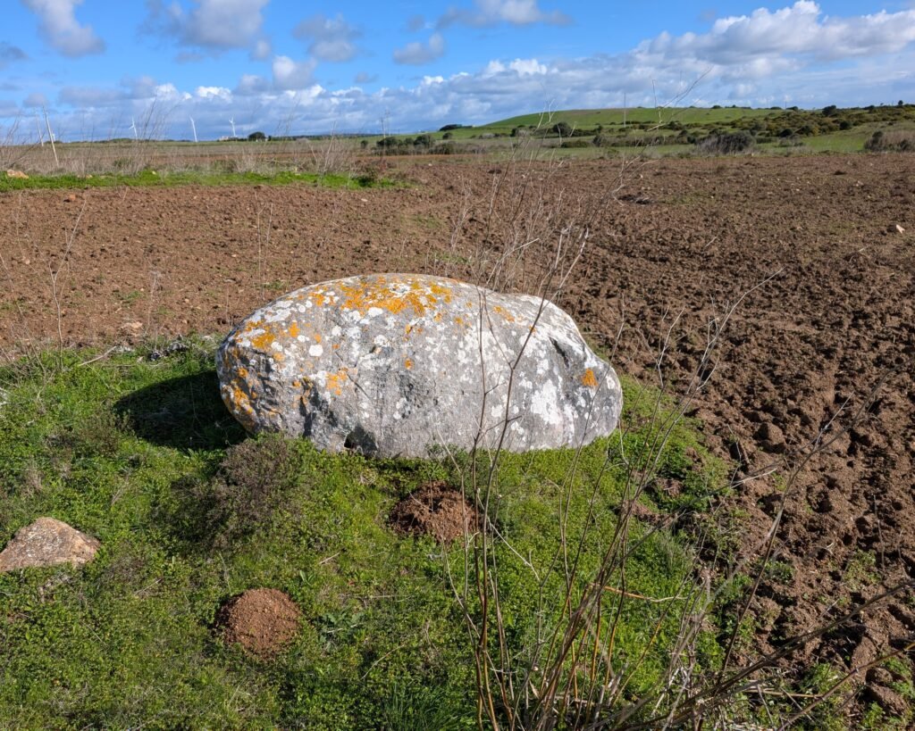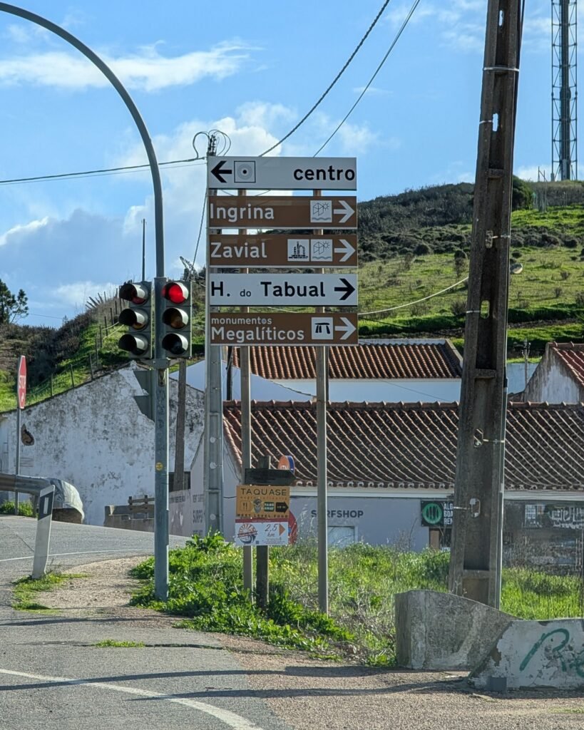 There are signs in Raposeira (the town just west of Vila do Bispo, on the road to Lagos) directing you to the “Monumentos Megalíticos.” There is another “Monumentos Megalíticos” sign on the road near the geodesic marker of Milrei. The stones themselves are not signposted.