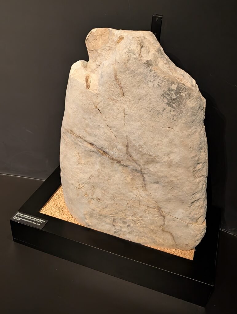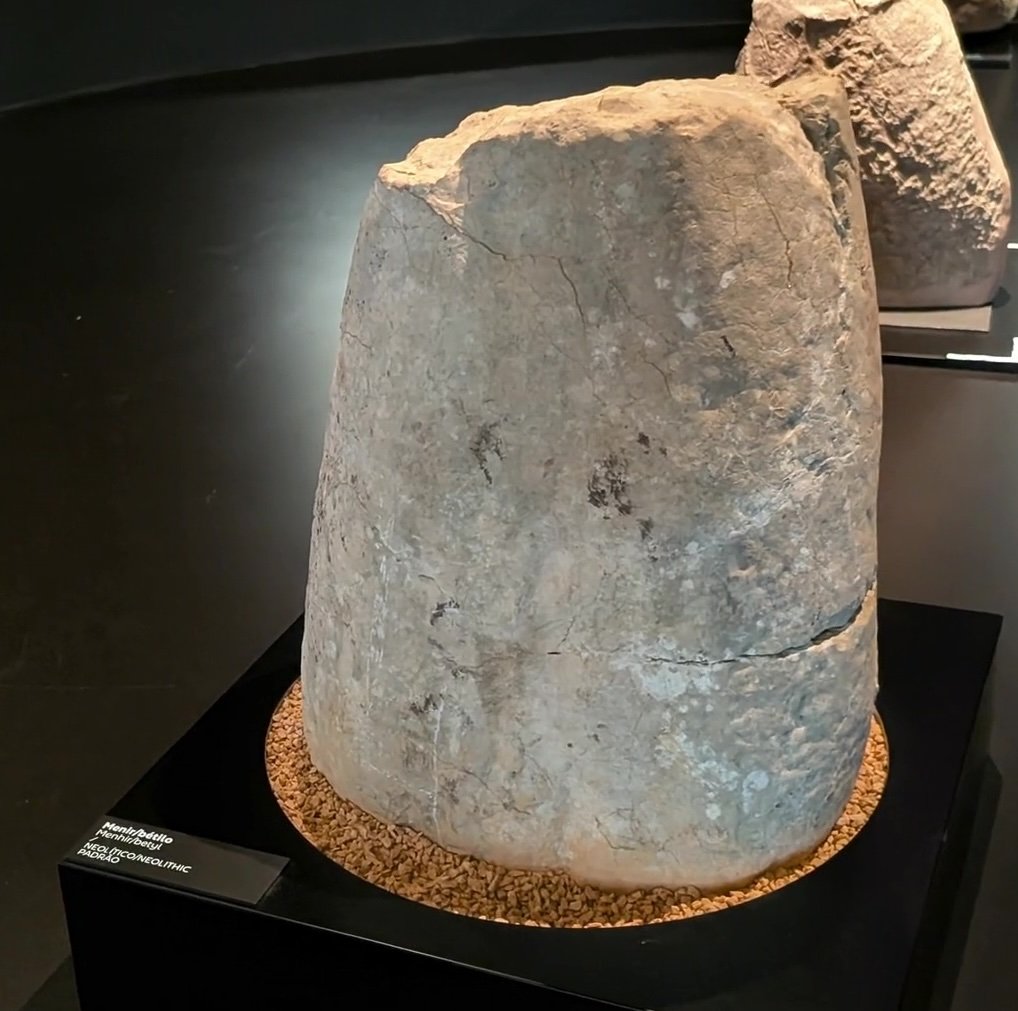 Menir 9 is lying on its side and broken, like many others. But it is lying on a 5m wide stone tumulus (tomb structure). Excavation of this structure allowed the identification of fragments of stone tools and fragments of prehistoric ceramic vessels, shells, and more8.
