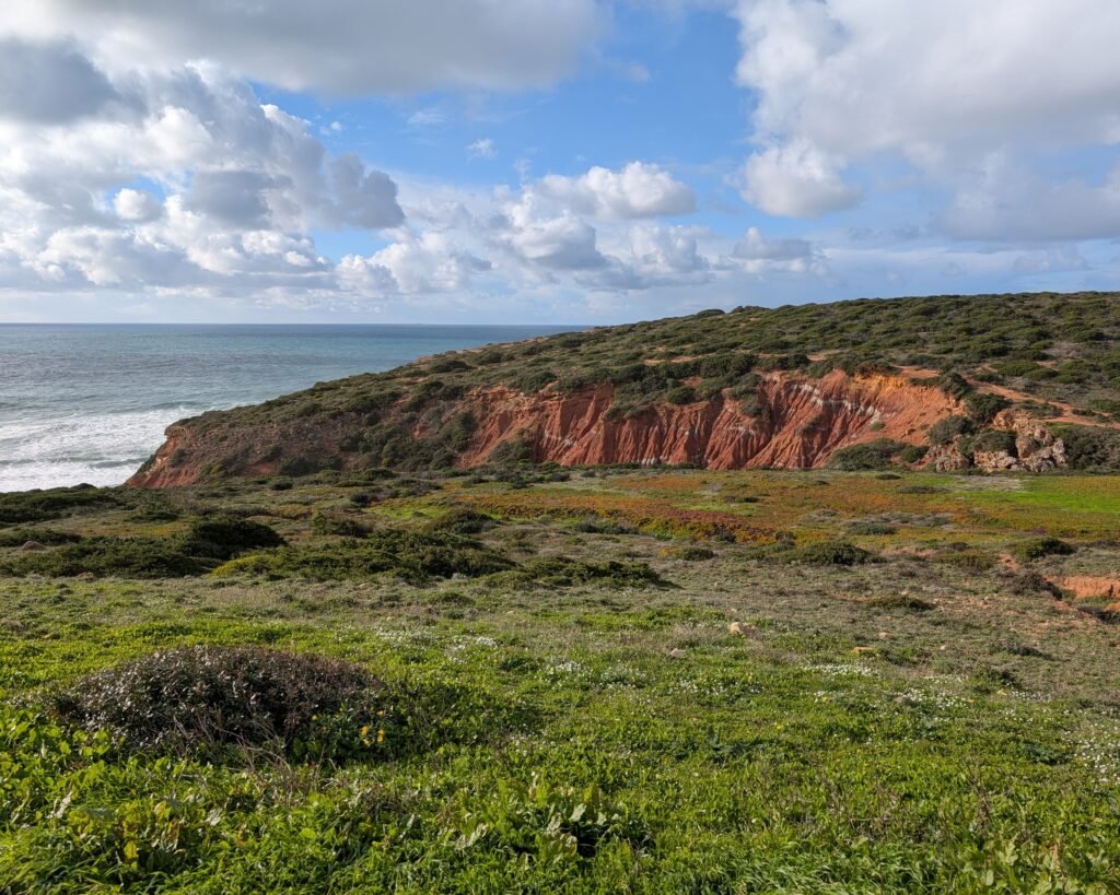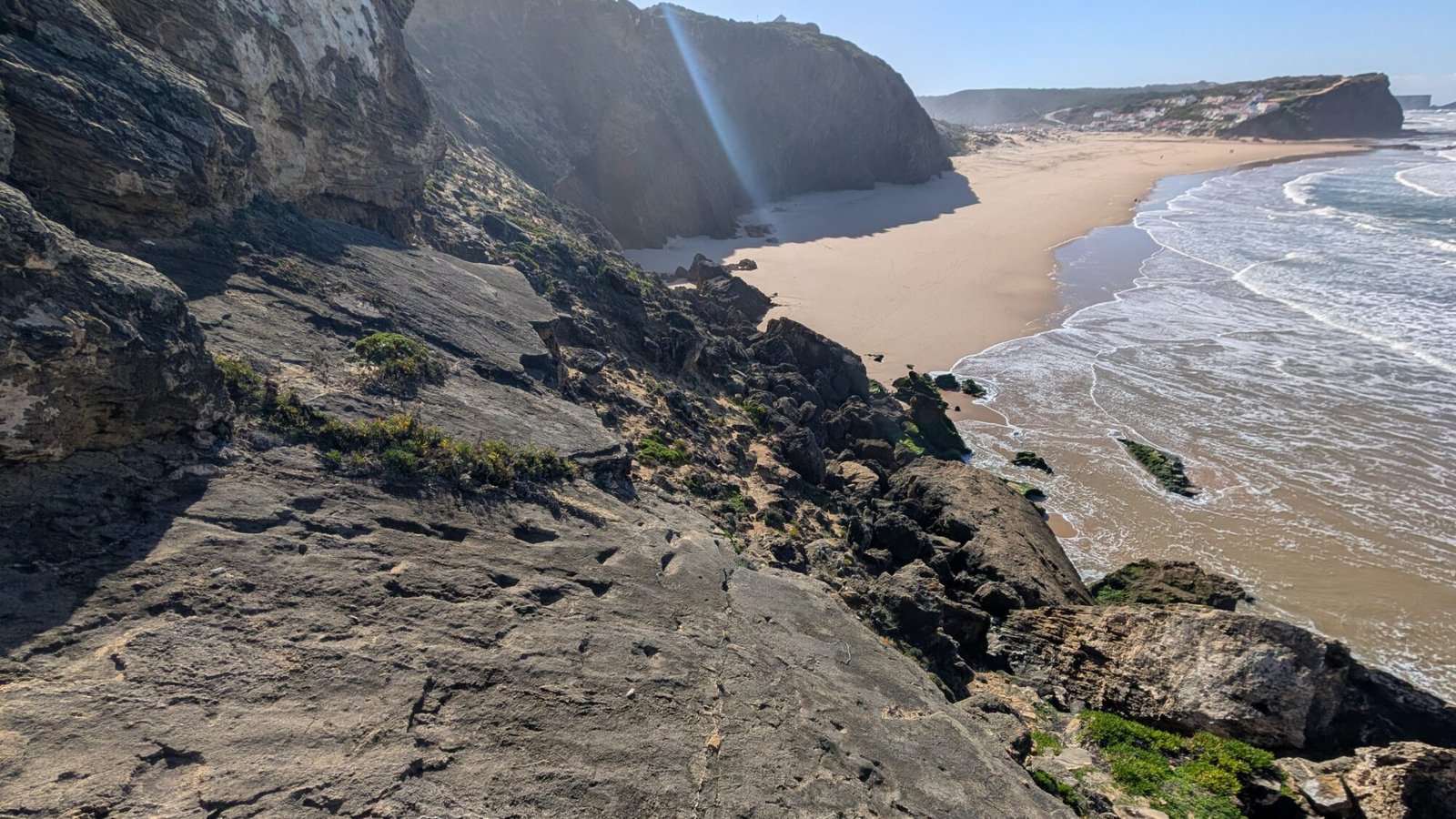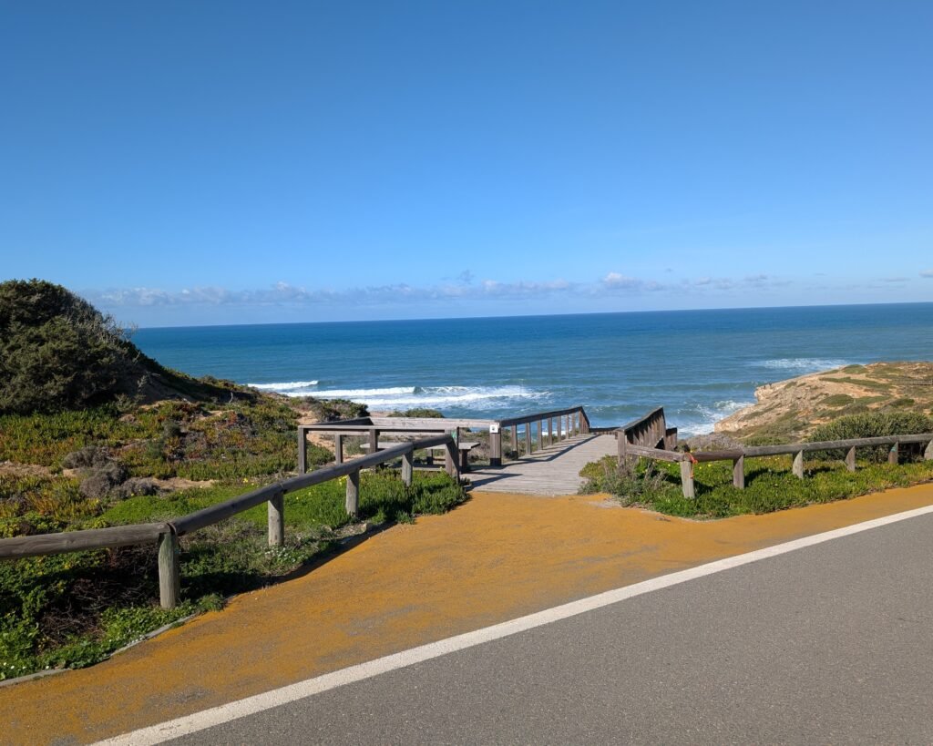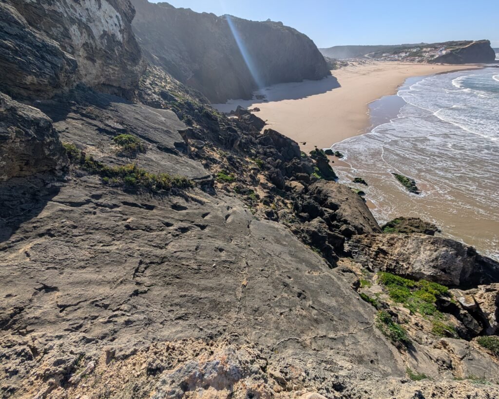 The Praia de Monte Clérigo site (with multiple trackways) is accessible, although not for people with mobility issues. From the road above Praia de Monte Clérigo (heading north towards Praia da Amoreira), you walk down a wooden ramp (coordinates 37.344307, -8.849790) and then climb down over sand and stones to the cliff edge over the beach. From there you can easily see the fossilized footprints, and if you are steady of foot and very brave you can climb down onto the stone. Please treat the fossils with great care!