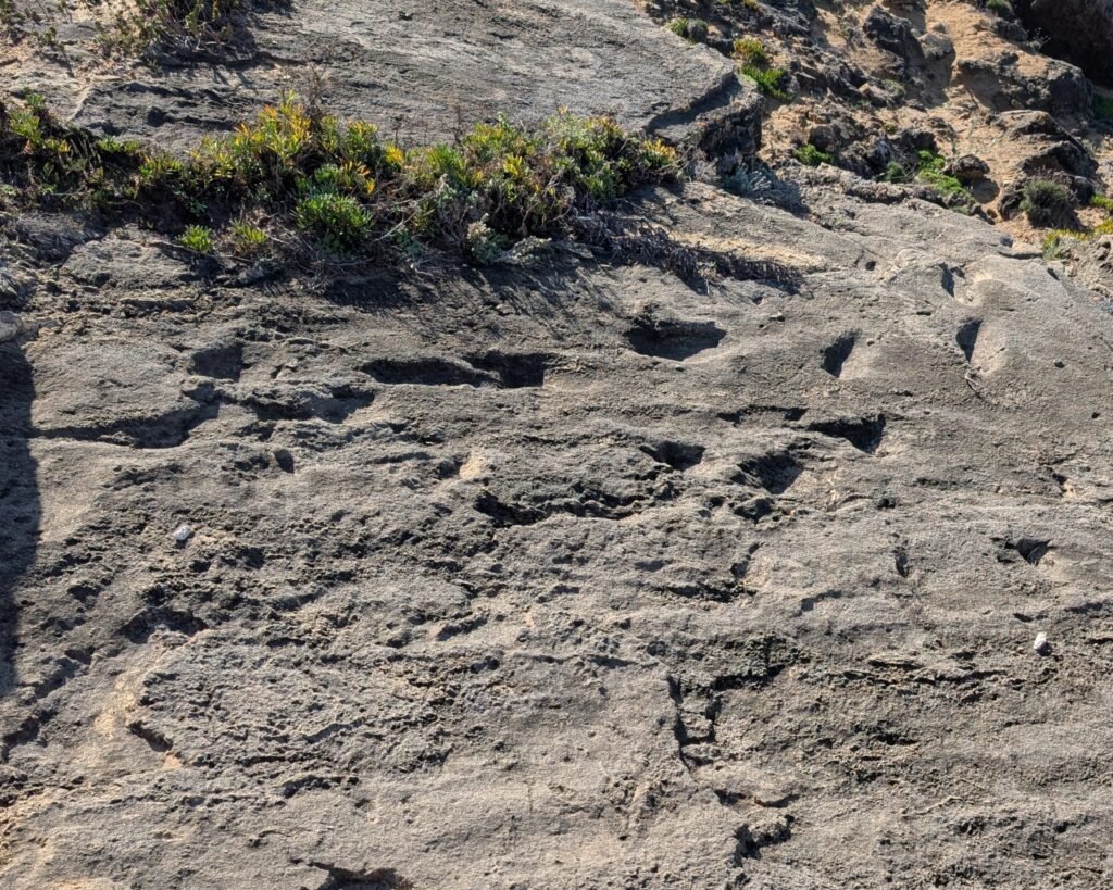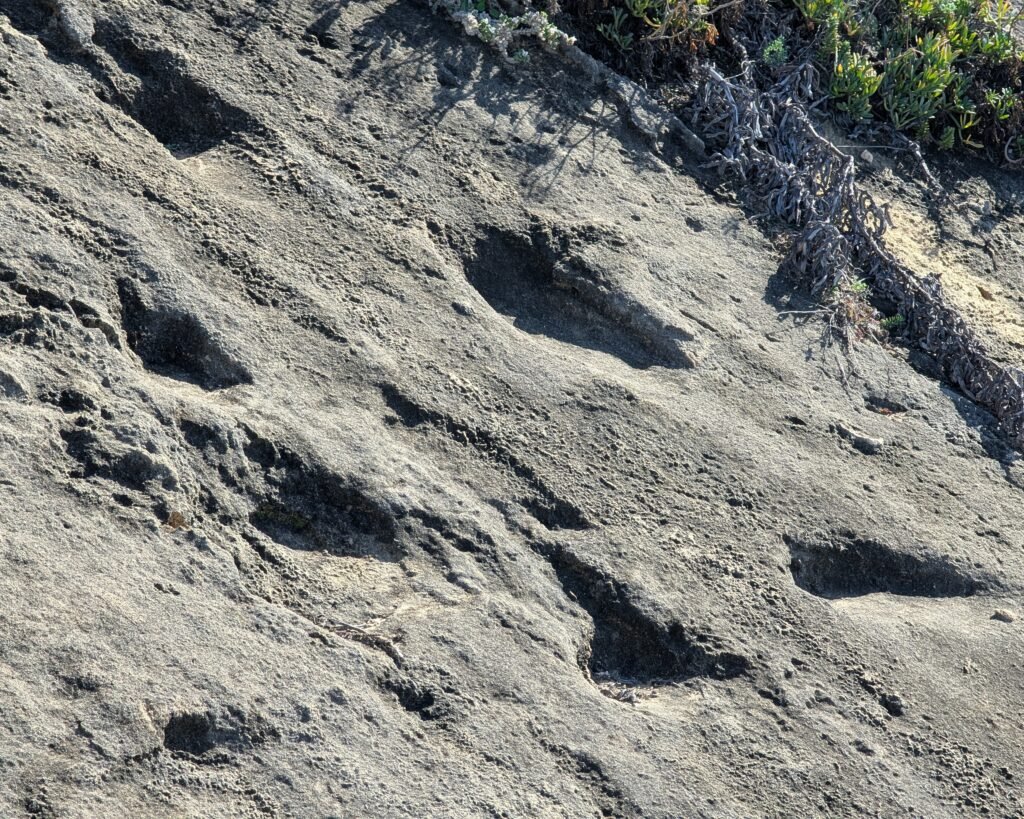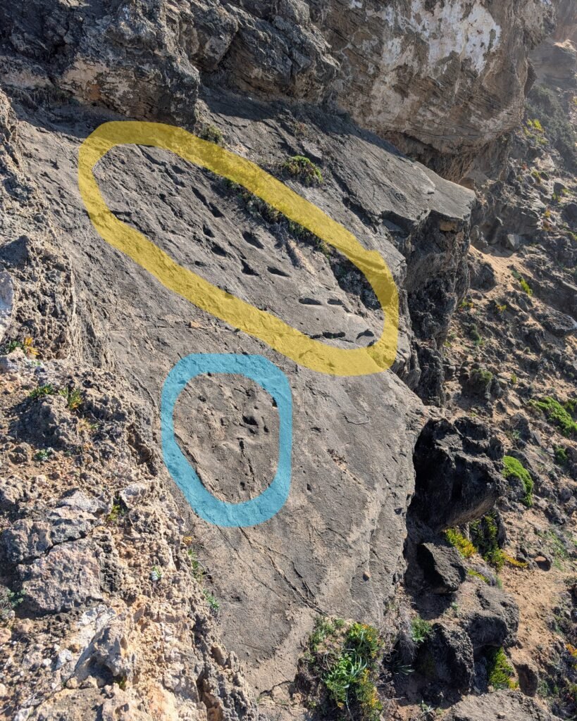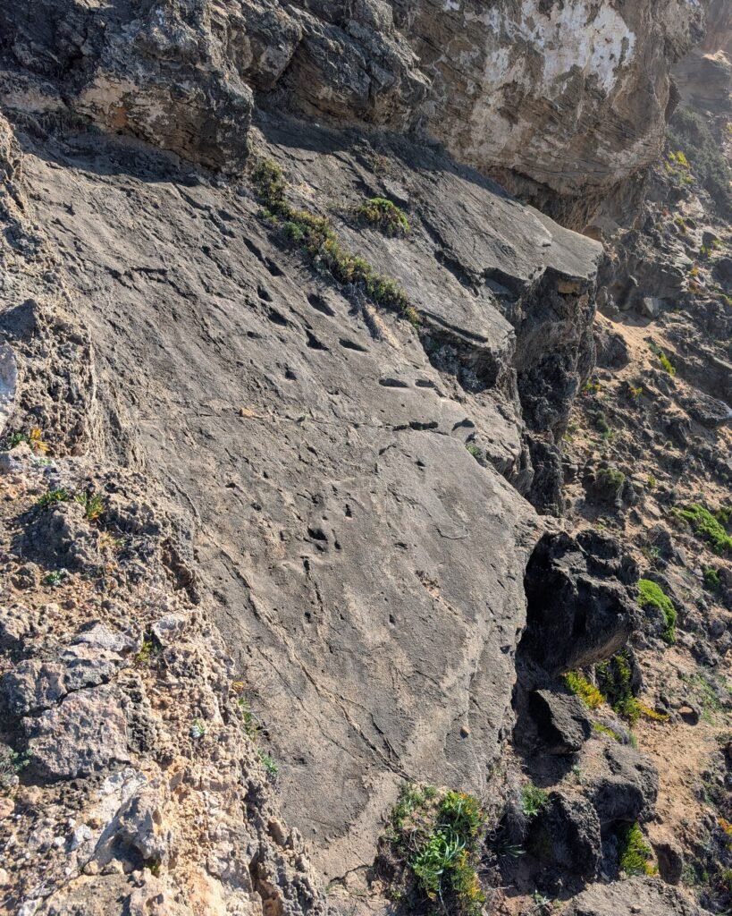 In 2020, archaeologist Carlos Neto de Carvalho and his Geographer wife, Yilu Zhang, discovered these fossilized footprints while exploring Monte Clérigo beach.1 After careful study of the site by a team of archaeologists and other scientists, their findings were published in 2025.2