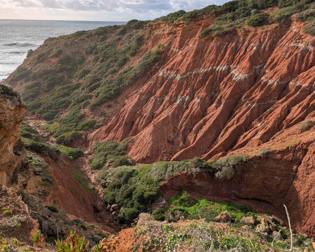 The Praia do Telheiro site (with a single print) is hard to get to. You can drive to a viewpoint overlooking Praia do Telheiro, but it’s a challenging climb down to the beach. From there, you will have to scramble up the creek bed to the fossil site. (It may be possible to climb down to the creek from above.) I did not attempt the climb. Again, if you go to the site, please treat the fossil with great care!