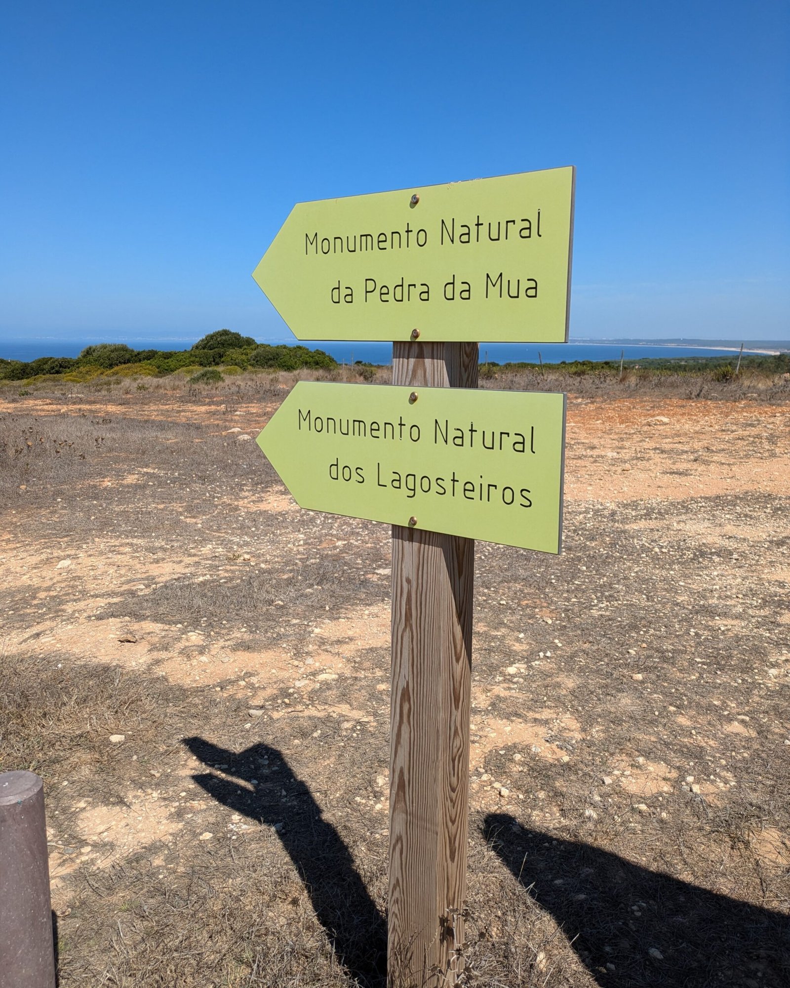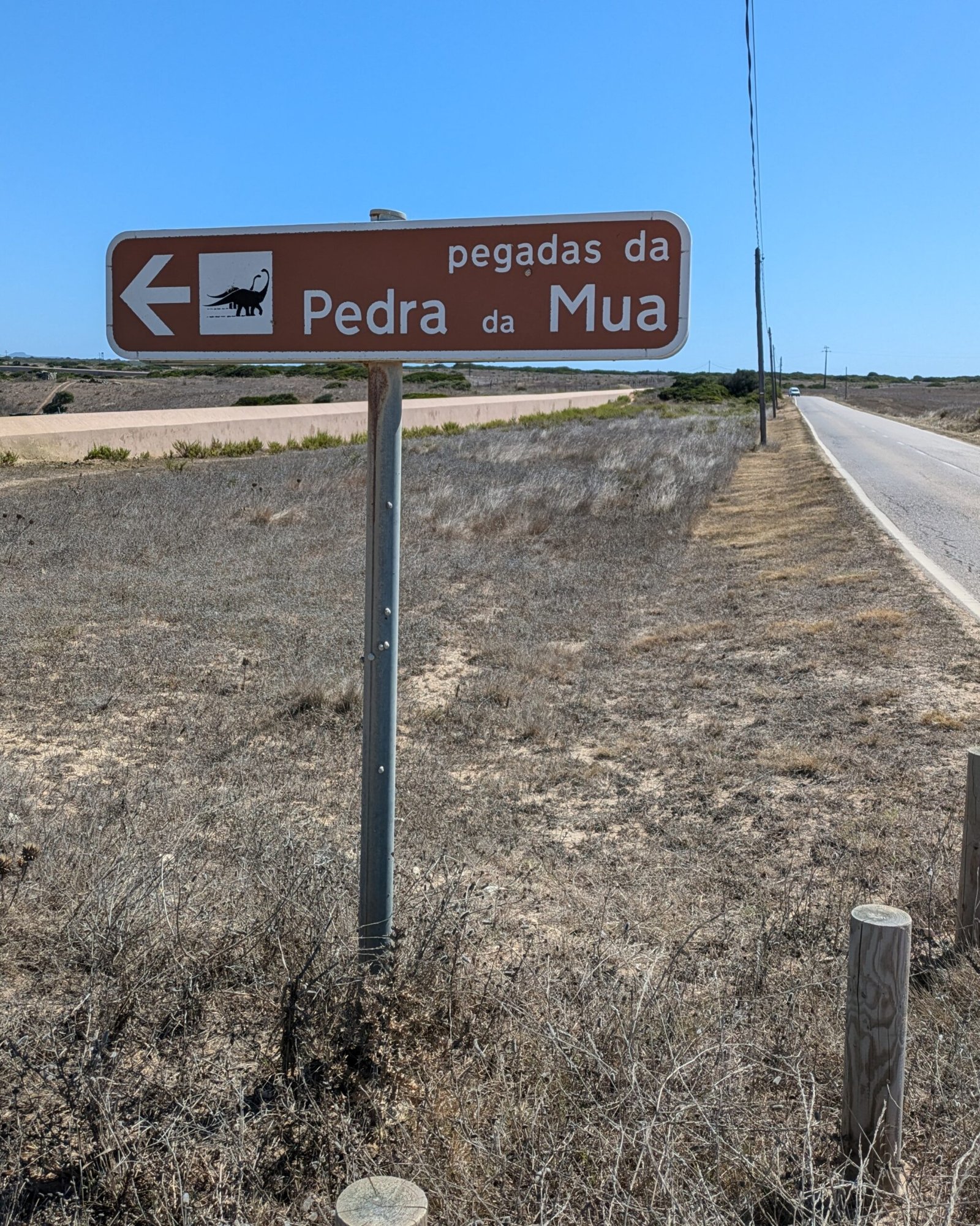 On the road, there is a sign to the Pedra da Mua natural monument of dinosaur footprints (“pegadas”). In the car park there are trail signs, pointing out both Pedra da Mua and Lagosteiros. There are also notice boards with a map of the hiking trail (in Portuguese) and more information about the fossils (in English and Portuguese).