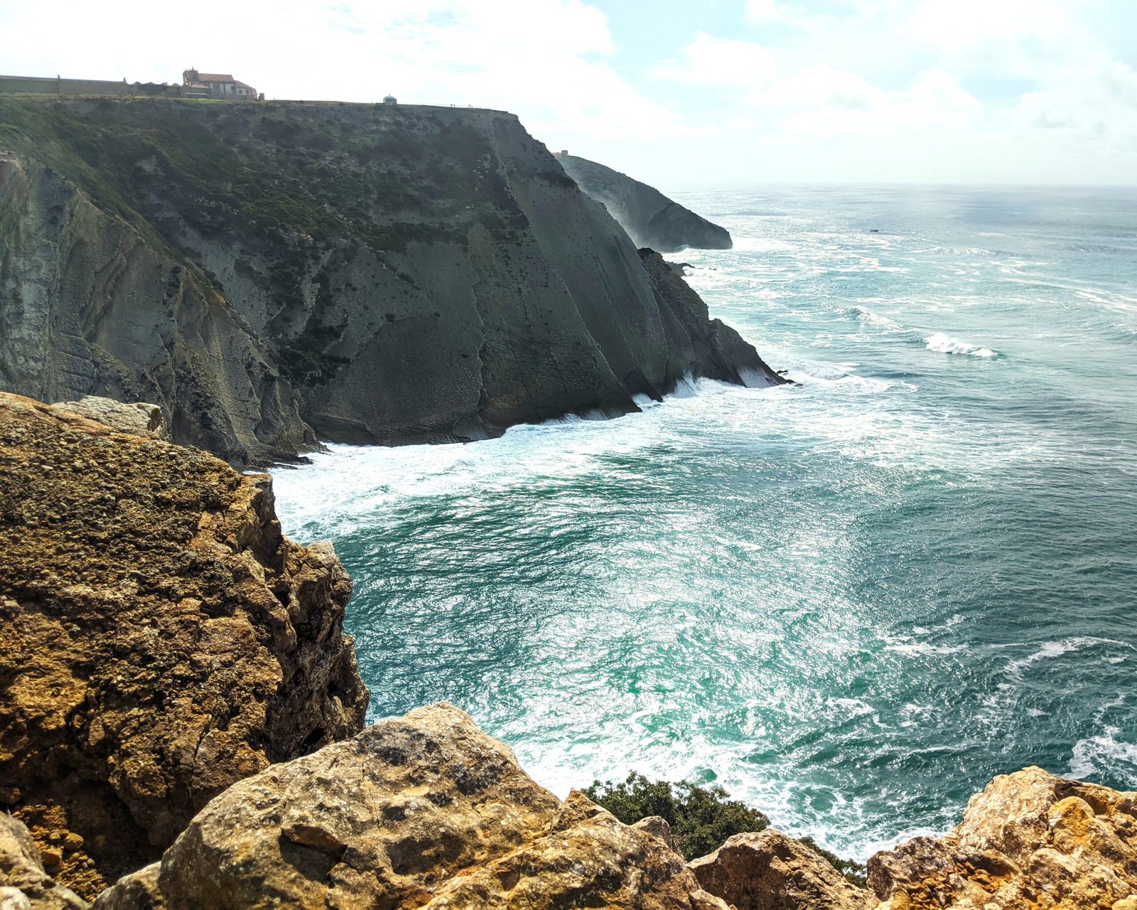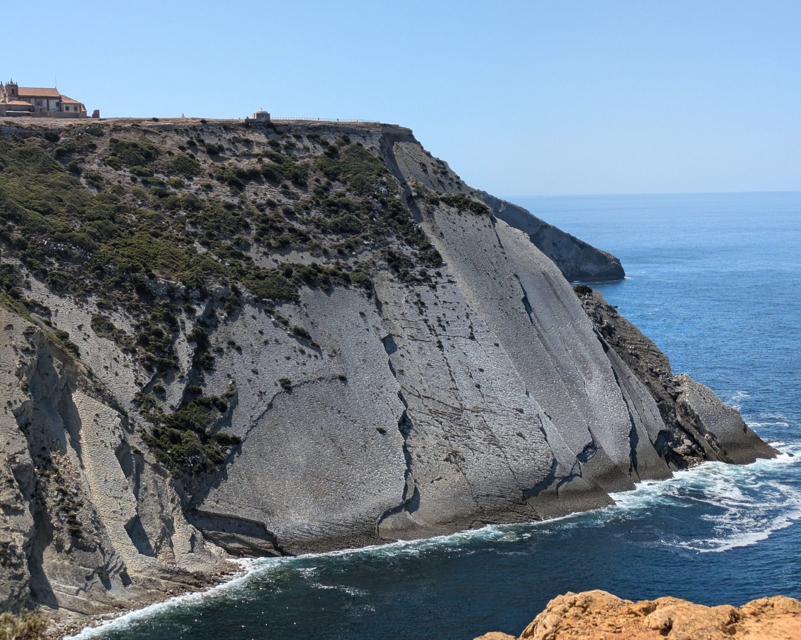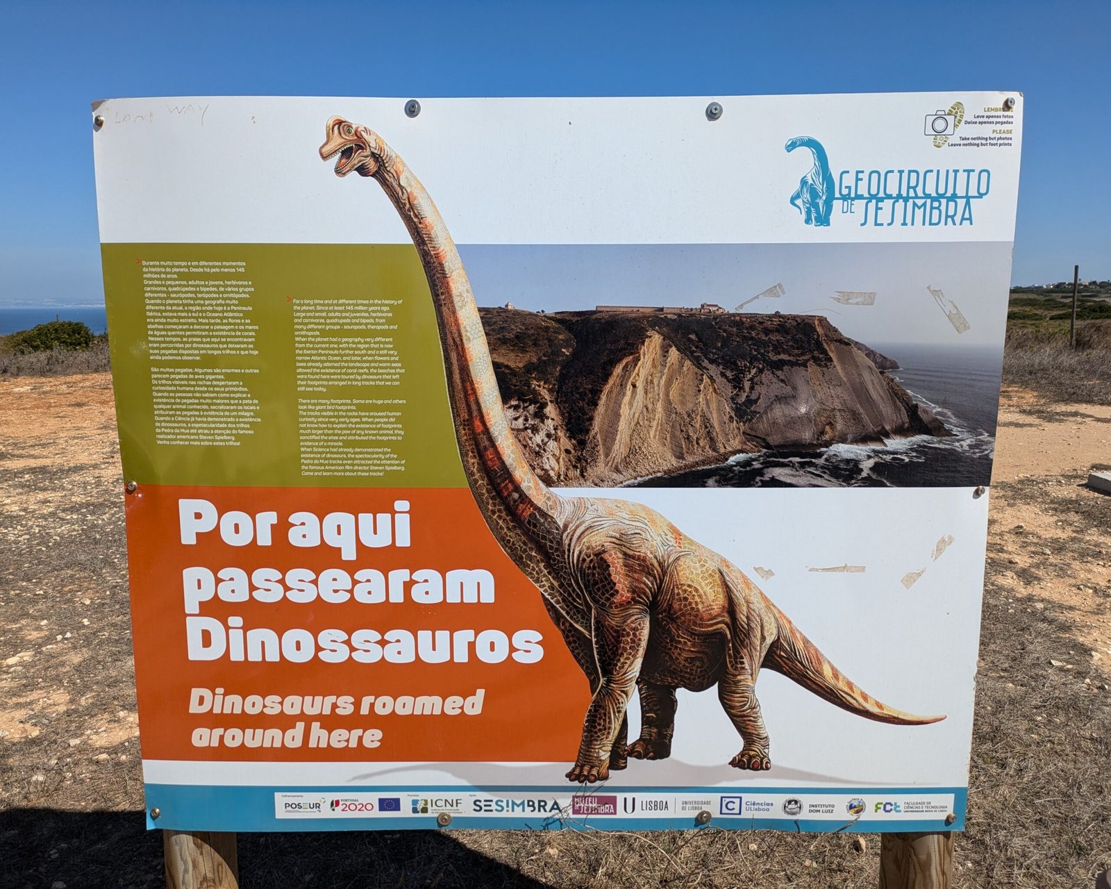 The Natural Monument is on Cape (Cabo) Espichel, in the Setúbal district. The footprints are on the cliffside of the Cabo Espichel …but the viewpoint from which you can see them is across the bay. (To see them up close, you need climbing gear or a helicopter!)