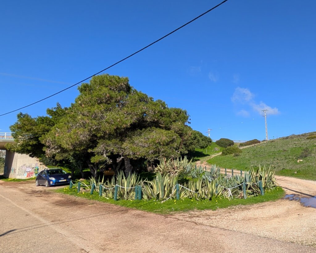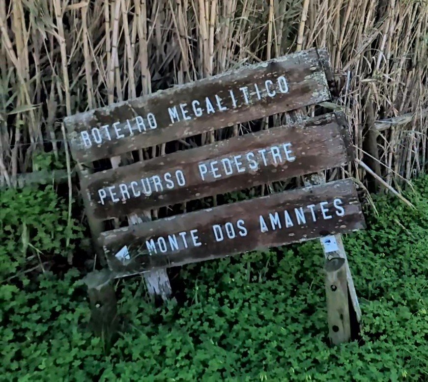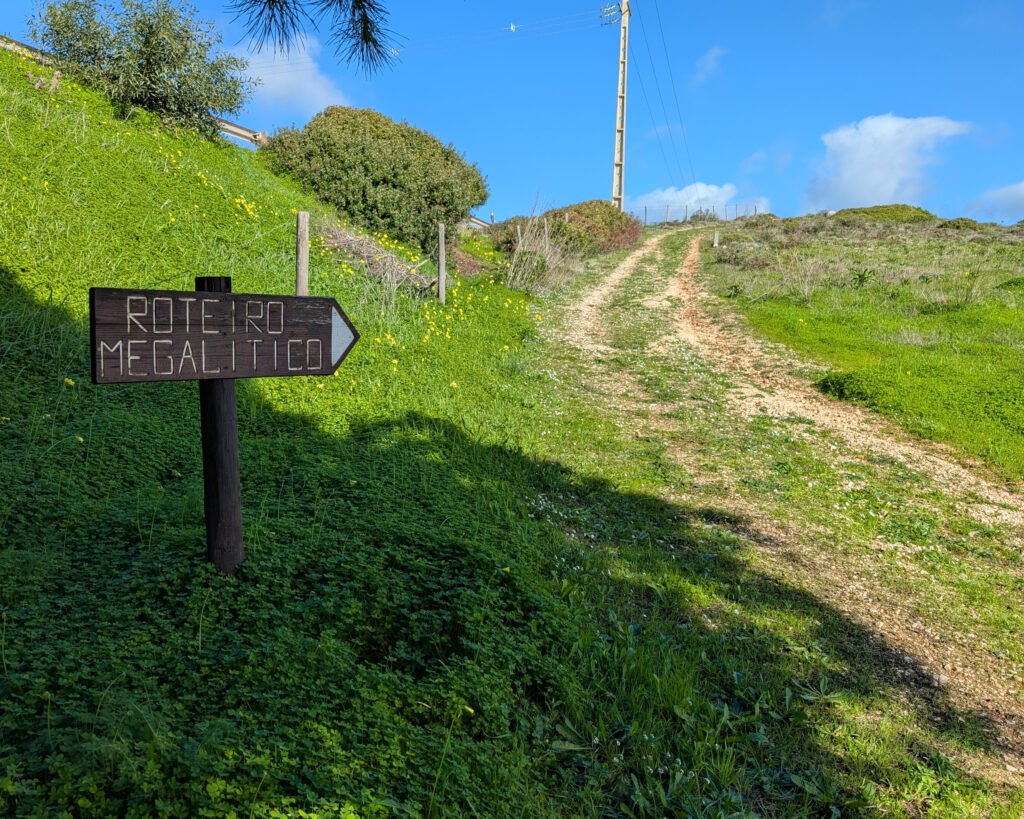 At the turn where the road goes under the main Bispo-Sagres road, there is a sign pointing out the “Roteiro Megalítico” (Megalithic Route) and “Percurso Pedestre” (Pedestrian Trail) for Monte dos Amantes. On the track behind the wooded park, there’s a sign pointing up the hill for the “Roteiro Megalítico.”