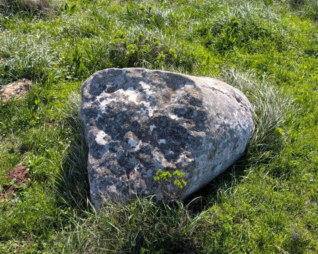 The first menhir, on the top of the hill, is about 2m long. It has carvings in the shape of a series of ellipses along one side2. They are hard to see, but can be felt. The second menir, on the hillside beside the trail, is very broken.