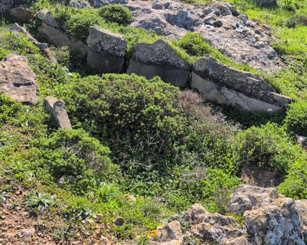 Head south out of Vila do Bispo past the Lidl supermarket. A little more than 1km out of town, there’s a left turn through a tunnel under the main road heading to Sagres. (The sign is below.) Go through that and just on the other side of the tunnel there’s a parking area next to a small wooded park with a swing. The Pedra Escorregadia site is just up the hill from this park, a short walk along a dirt road.