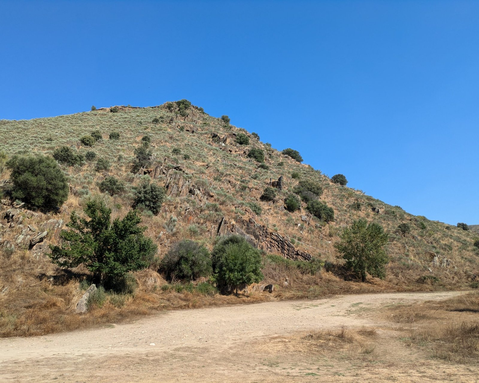 The site is on the right side of a bend in the Côa River, with another site, Quinta da Barca, on the opposite bank. (Official visits to that site are not organized.) Aldina takes advantage of the cool shade by the river to explain the history of the engravings and the lifestyle of the Paleolithic people who carved them, ten to thirty thousand years ago. The Penascosa hill serves as a backdrop for the explanation, and as she talks we can just make out an engraving from our distant perspective. When freshly carved, the engravings must have been clearly visible. (Aldina explains that the patina which forms on the stone over the years dulls the stone and limits the visibility.)