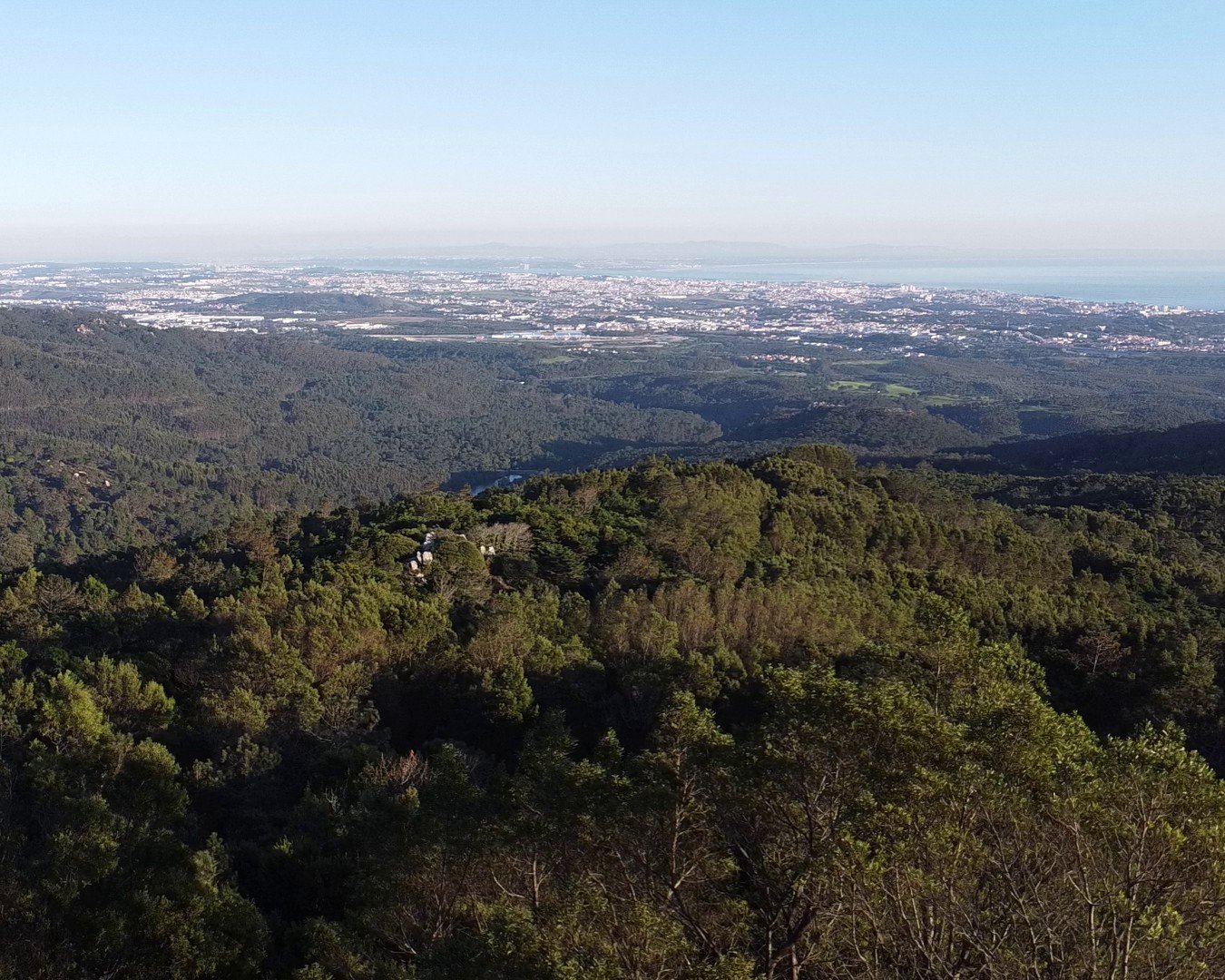 The location of the tholos is at the third highest peak of the Sintra Hills (Serra de Sintra), called Monge (or “Monk”), at 490m. (There is a geodesic marker identifying the peak, right next to the tholos.) From this peak, there are amazing views that would have been more obvious when it was built: at that period the climate was more arid and would have had fewer tall trees.